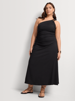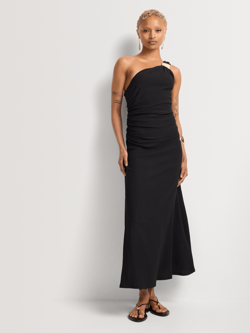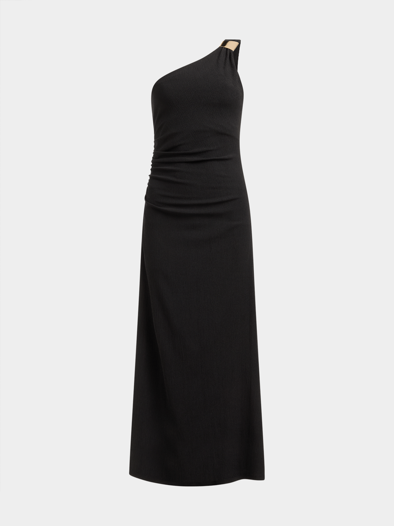 Get ready for date night or a stylish event with our Asymmetrical Sleeve Hardware Detail Column Dress. The on-trend asymmetrical sleeve is elevated with hardware. Coordinate your jewellery and accessories with the metal accent for a cohesive look.