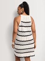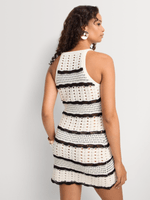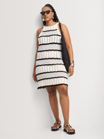Our Openwork Knit Column Mini Dress is perfect for warm summer days and laid-back vibes with its open knit and striped design. Wear it with flatforms and add a woven shopper bag.
