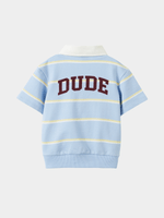 Relaxed fleece top, short sleeve set in. Collar and collar stand, CF button placket and ribbed hemband