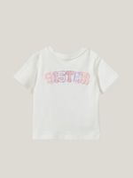 Introducing the Cotton On Baby White Jamie Short Sleeve T-shirt, a must-have for your little one's wardrobe. Made of 100% cotton for ultimate comfort. Features include unique prints, a rounded neckline, snap closures at the neck, short sleeves, and a straight hemline. Perfect for kids aged 2-8 years. Wash before wear for best results. Why wait? Add this stylish tee to your cart today!