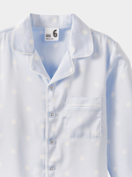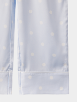Woven pyjama satin set Button down, long sleeve top Front self fabric patch pocket on chest Woven pant with elasticated waistband Piping detail Made from recycled polyester