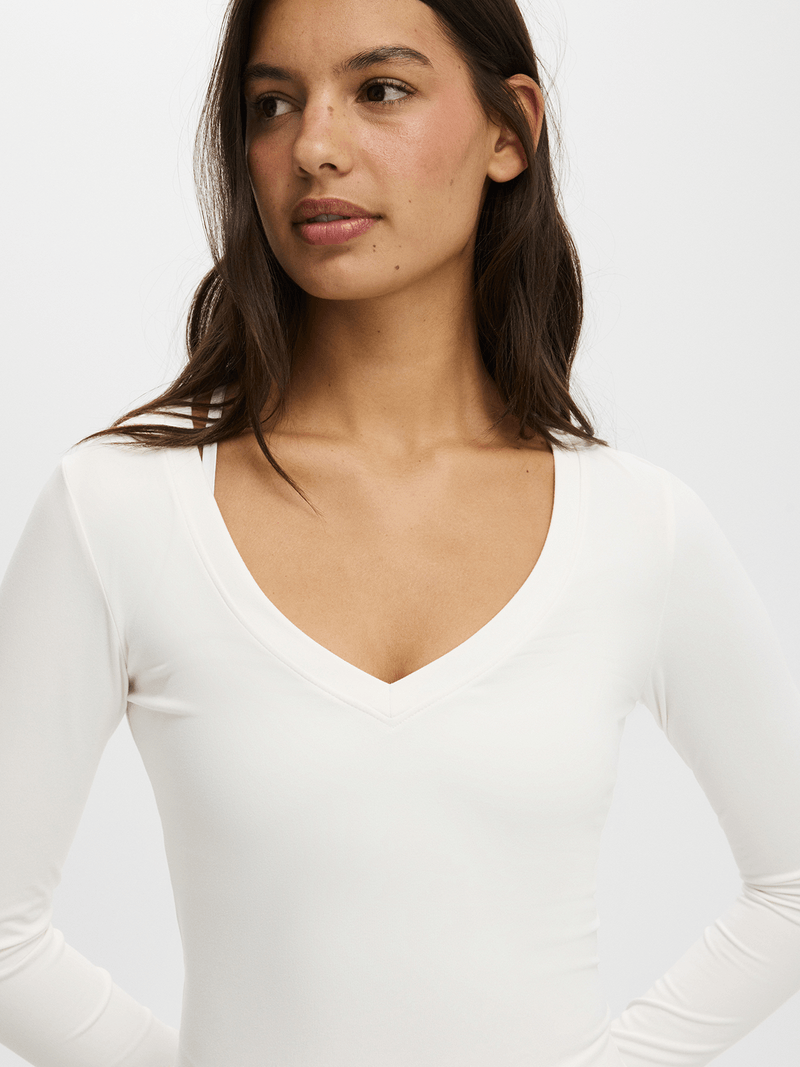 - Deep scooped front V neckline