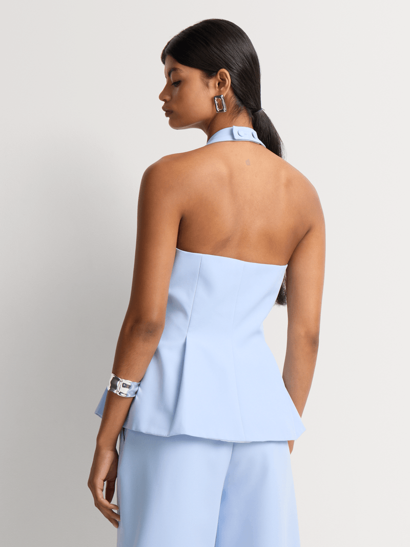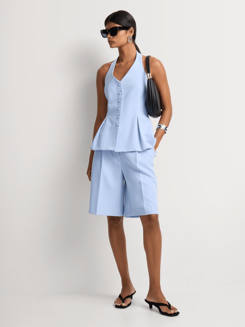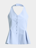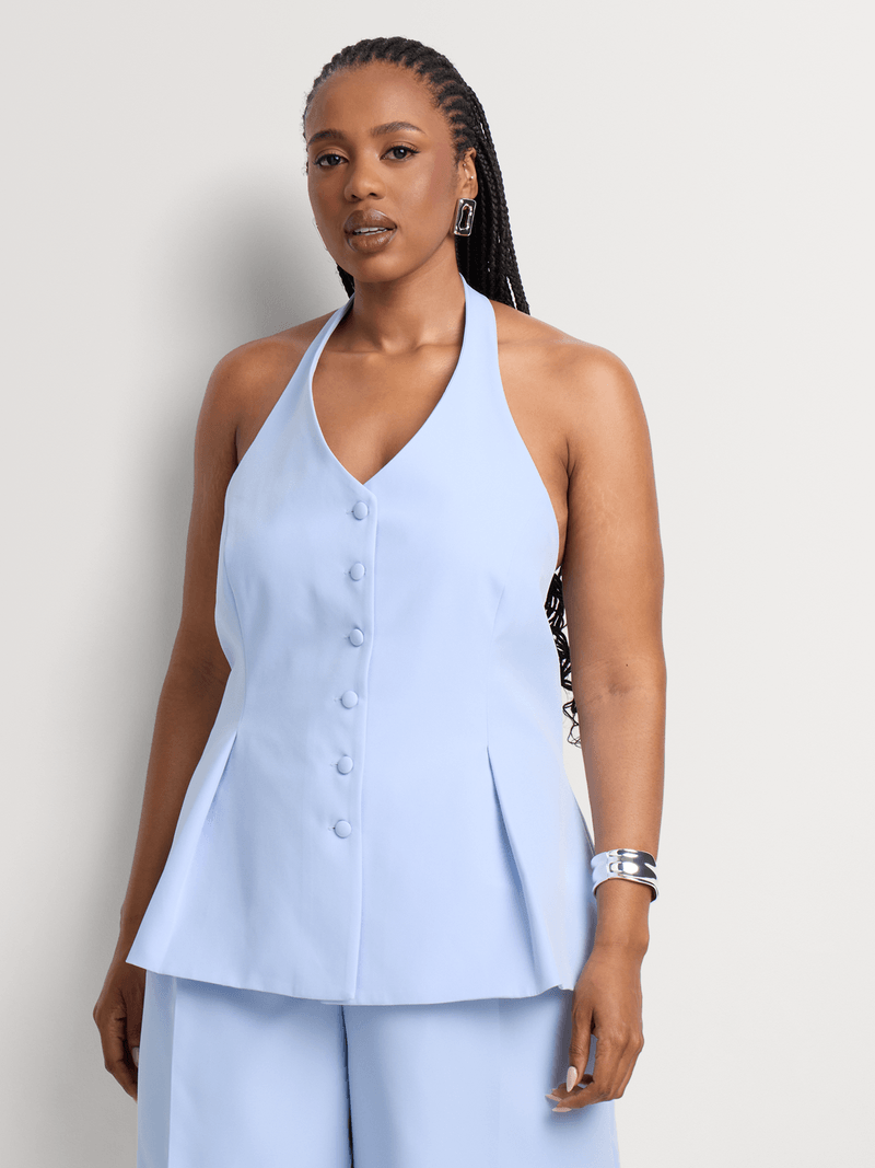Sleek and sophisticated, our Covered Buttons Halter Neck Waistcoat is an on-trend piece this season. Wear this suiting-inspired style with the matching bottom, or pair it with a satin maxi skirt, wide leg denim, or Bermuda shorts.