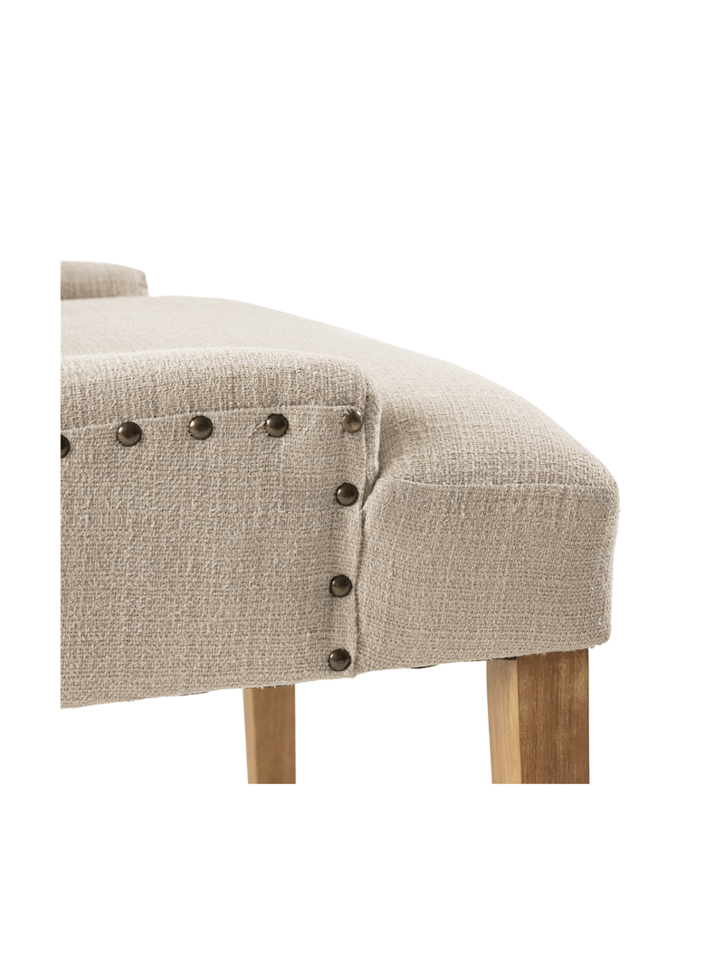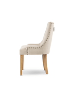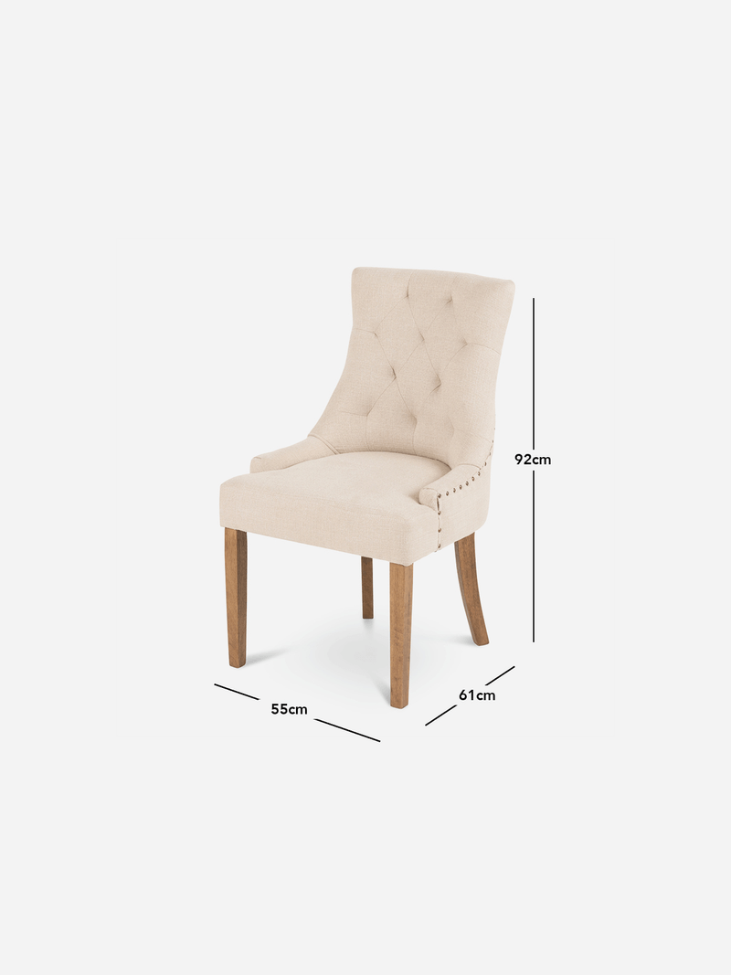 The Cuddle Back Dining Chair is a timeless addition to your dining table. With a plush padded seat, sumptuous button tufted backrest and low profile armrests, it offers ultimate comfort for everyday meals and elegant dinner parties. Fully upholstered in a linen-blend fabric, a studded finish paired with metal ring detail completes the classic style of this elegant dining chair.