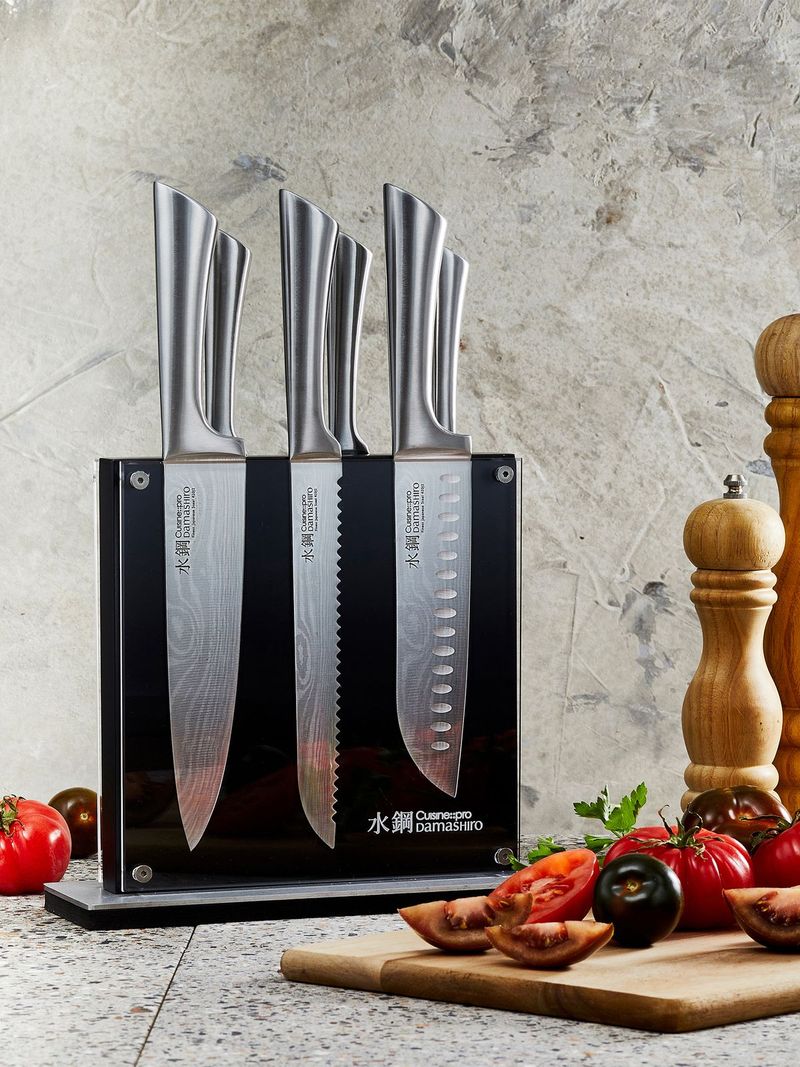 The Cuisine::pro Damashiro Kin Knife Block includes 6 Japanese Steel knives in a stylish storage block with clear sides designed to showcase your distinctive Damascus-inspired blades.