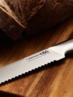 The Cuisine::pro iD3 Bread Knife allows you to cut thick crusted breads without crushing or tearing their soft centers. Its measured serrations help cut through foods with tough exteriors. The asymmetrical handle design of the Cuisine::pro iD3 combined with the trademarked MicroDot Technology, provides more grip and safer knife control.