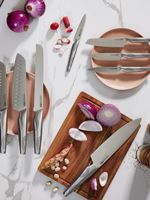 Cuisine::pro iD3 Ryu Knife Block includes 8 knives housed in a stylish modern storage block with clear sides to showcase your blades. The asymmetrical handle design of the Cuisine::pro iD3 combined with the trademarked MicroDot Technology, provides more grip and safer knife control.