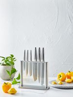 The Cuisine::pro iD3 Samurai Gozen Knife Block set includes 6 knives in a stylish knife block with tempered glass clear sides to showcase your blades.