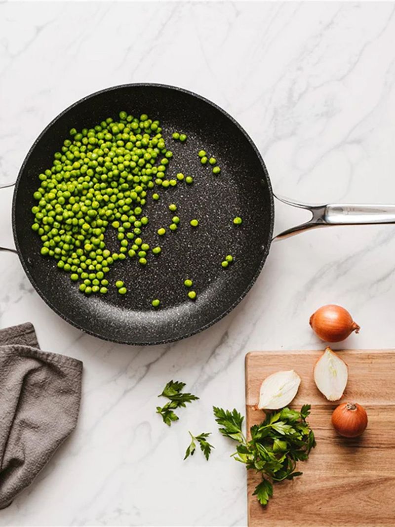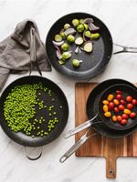 The pan's heavy gauged forged body and thick base ensure even cooking and prevent warping, while the riveted cast stainless steel handles stay cool and are comfortable to hold.