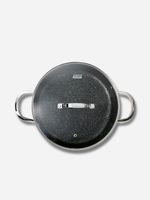The pan's heavy gauged forged body and thick base ensure even cooking and prevent warping, while the riveted cast stainless steel handles stay cool and are comfortable to hold.