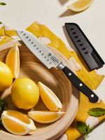 The Cuisine::pro Wolfgang Starke Santoku Knife is a kitchen all-rounder, ideal for cutting, slicing, chopping, dicing, mincing and so much more. It is the perfect knife for cutting meats, slicing cheeses, and chopping or dicing vegetables and nuts. The recessed scallops above the blade's edge help to release thin slices and sticky food after slicing. This range is forged to produce perfect control, weight and balance with durable polymer handles for a comfortable grip.
