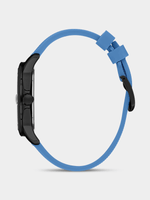 This stylish watch features a Black Plated round case, sleek black dial and blue silicone strap.