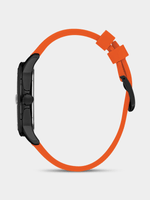 This stylish watch features a Black Plated round case, sleek black dial and orange silicone strap.