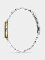This stylish watch features a Gold Plated round case, black and gunmetal toned dial and two-tone Gold Plated Stainless Steel bracelet strap.