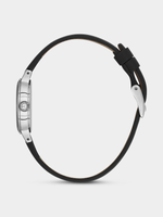 This stylish watch features a Silver Plated round case, white Mother of Pearl dial and black genuine leather strap.