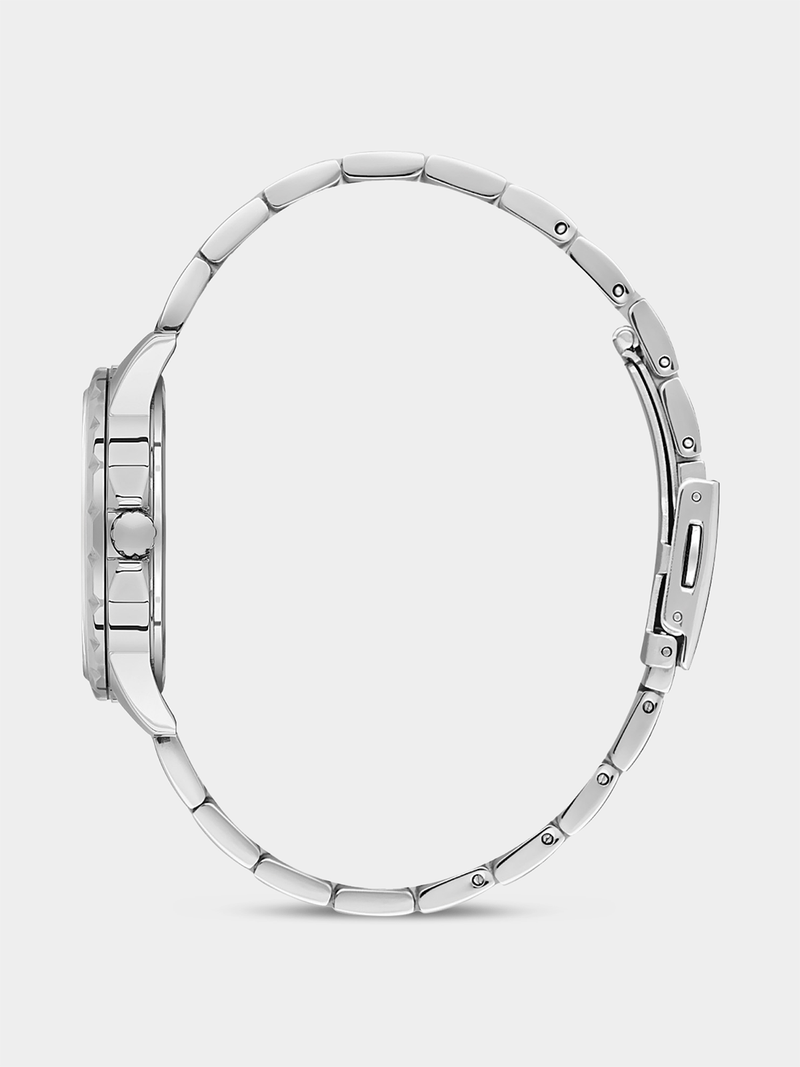 This stylish watch features a Silver Plated round case, sleek silver toned dial and Stainless Steel bracelet strap.