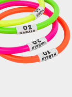 4 multicolored, weighted aquatic rings designed for use in swimming and water sports. Designed for children at ease in water who are discovering the pleasure of going underwater. To be used under adult supervision.