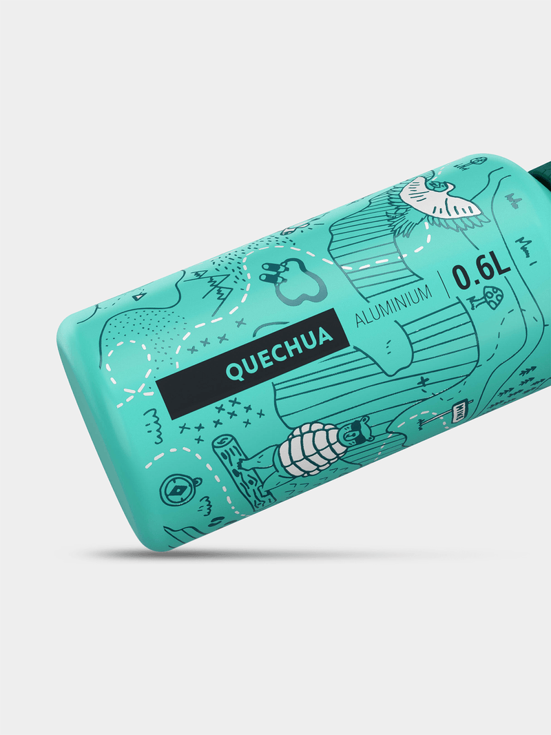 Great for children, this QUECHUA 0.6L Aluminum Bottle is perfect for hiking and camping adventures. It features an instant-open cap and pipette for easy, one-handed drinking, making it a robust and lightweight companion for young outdoor enthusiasts.