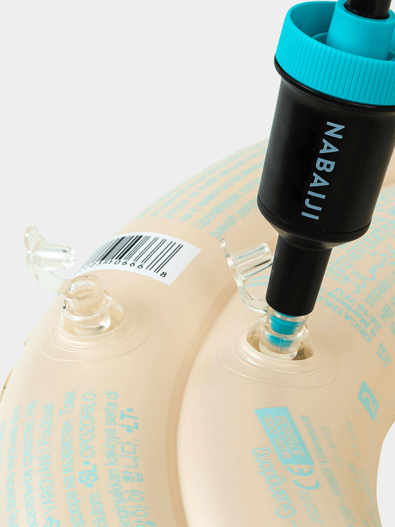 This swim ring has two inflation chambers for stability. The inflation chambers are fitted with one-way check valves. Only use under adult supervision