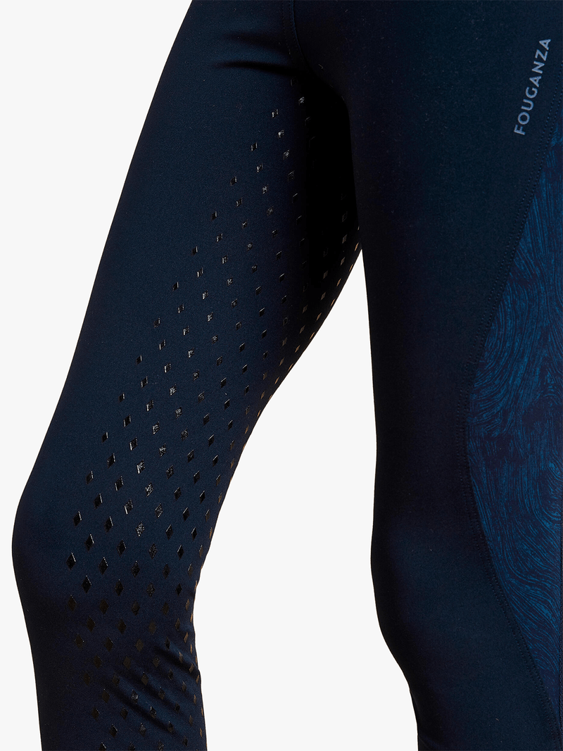 - These junior navy leggings are designed for kids who love horse riding, featuring a full grip 500 print that provides comfort and support during their equestrian adventures