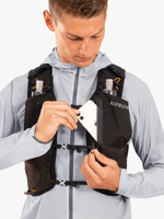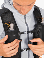 There are 5 pockets at the front of this trail running bag: 2 pockets for 500ml soft flasks (not included), a patented zipped pocket, waterproof phone pocket, as well as 2 pockets for your gels or cereal bars. In addition, we added 2 side pockets and 4 rear pockets: 1 kangaroo pocket, but also a large compartment with side zip which contains its own zipped pocket, as well as a large pocket designed for the one-litre water bladder (included).
