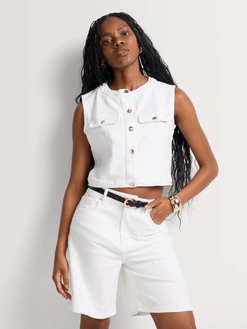 Our FF Denim Cropped Waistcoat is an on-trend addition to your denim stash. Wear it with jeans for a denim-on-denim look, or pair it with floaty maxi skirts or floral maxi dresses.