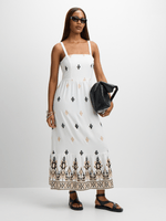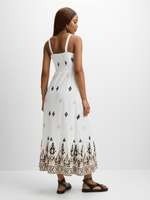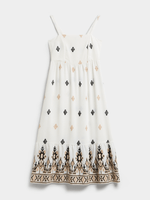 Enjoy the summer sun in style with our white embroidered shirred sundress from Exact. Made from rayon blend fabric, this dress features a shirred bust, flattering fit, and embroidery details that add a unique touch. Enjoy the summer vibes wherever you go.