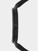 Emporio Armani's 42mm watch features a black matte dial, three-hand date movement and black leather strap.