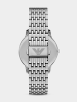 Emporio Armani's 39mm watch showcases a captivating blue sunray dial with a domed crystal, three-hand date movement, and a sleek stainless steel bracelet.