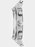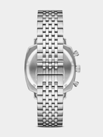 A 40 mm, cushion-shaped case frames the rich blue sunray dial of this Emporio Armani watch with a quartz chronograph movement. Complemented by a stainless steel bracelet with both brushed and polished finishing and a date window at 6 o'clock, this watch is the perfect contemporary execution of vintage flair.