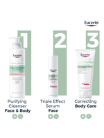 Eucerin DermoPurifyer Triple Effect Body Cream 200ml reduces persistent blemishes and post-acne marks. This body cream soothes irritations and redness, while intensely moisturising the skin. It combines triple benefits to keep your skin feeling soft and comfortable.