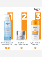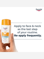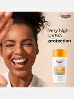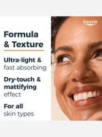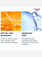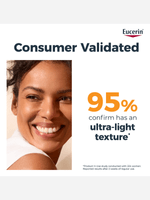 Eucerin SPF 50+ Sun Protection Hydro Protect Ultra-Light Fluid 50ml offers high UVA, UVB and HEVIS protection for all skin types. Its fast-absorbing, non-greasy formula features licochalcone A and glycyrrhetinic acid to soothe, repair and neutralise free radicals. This sunscreen ensures comprehensive protection with an invisible finish.