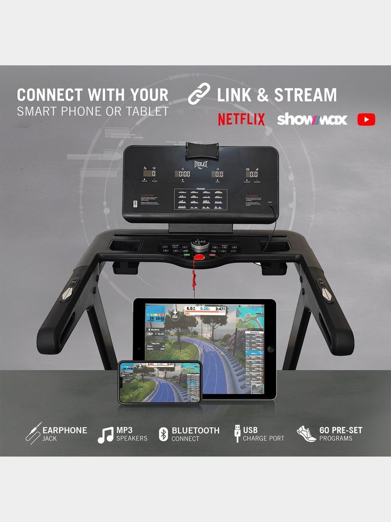 The Everlast Fortis Treadmill is top of the Everlast Treadmill range, as the largest of the treadmills on range, it offers the widest running deck, largest motor and heaviest maximum user weight of 150KGS along with all the bells and whistles: Bluetooth compatibility, Apps such as Zwift, Kinomap and Fitshow.