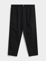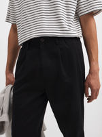 Elevate your style with these sleek black pleated pants. Expertly tailored for a modern tapered fit, they offer the perfect blend of comfort and style. Made from a cotton stretch fabric or durability and comfort. A versatile addition to any wardrobe.