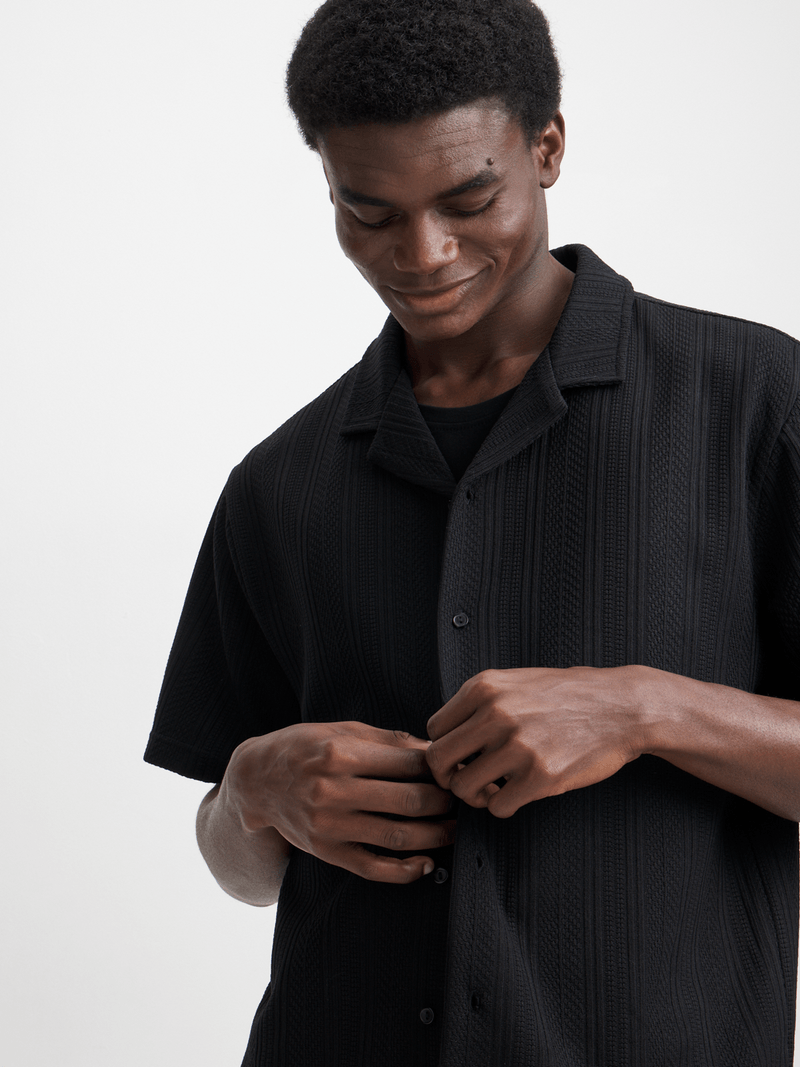 Elevate your wardrobe with this versatile black textured knit shirt from Exact. It features a classic collar, short sleeves, and a button-up design. Pair with shorts or chinos for a stylish look.