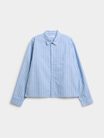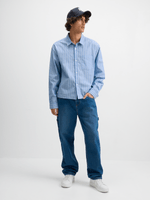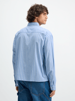 Stay cool and stylish in our men's blue striped boxy shirt from Exact. Made from 100% cotton fabric, this shirt features a boxy fit, chest pocket, and long sleeves. Pair it with your favorite bottoms for a casual yet put-together look.