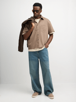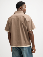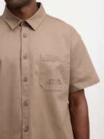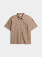 Get ready to elevate your style with our Exact brown crop boxy shirt. Made from cotton twill fabric, this overshirt features a cropped boxy fit, chest pocket with print, and short sleeves. Perfect for adding a fresh touch to your look.