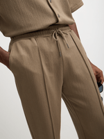 Stay relaxed and on-trend with these brown textured pants from Exact. These pants are perfect for any casual occasion, they feature a trendy pin tuck front seam, an elasticated waist, side pockets and a back pocket. Designed for comfort and style, these pants are a must-have in any wardrobe.