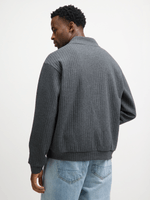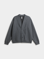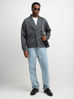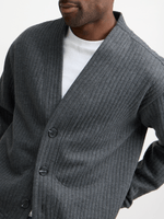 Stay warm and stylish with our charcoal ribbed cardigan. Made from cotton rich fleece, this cardi is perfect for chilly days. It features a classic ribbed design with a v-neck and brown buttons. Keep cozy and cool in this wardrobe essential.