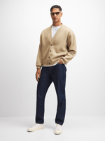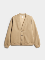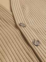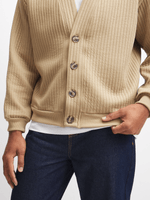 Stay warm and stylish with our natural ribbed cardigan. Made from cozy fleece, this cardi is perfect for chilly days. It features a classic ribbed design with a v-neck and brown buttons. Keep cozy and cool in this wardrobe essential.
