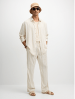 Elevate your wardrobe with this versatile natural striped shirt from Exact. Made from a linen blend fabric, it features a classic collar, long sleeves, and a button-up design. Pair with shorts or the matching pants for a stylish look.
