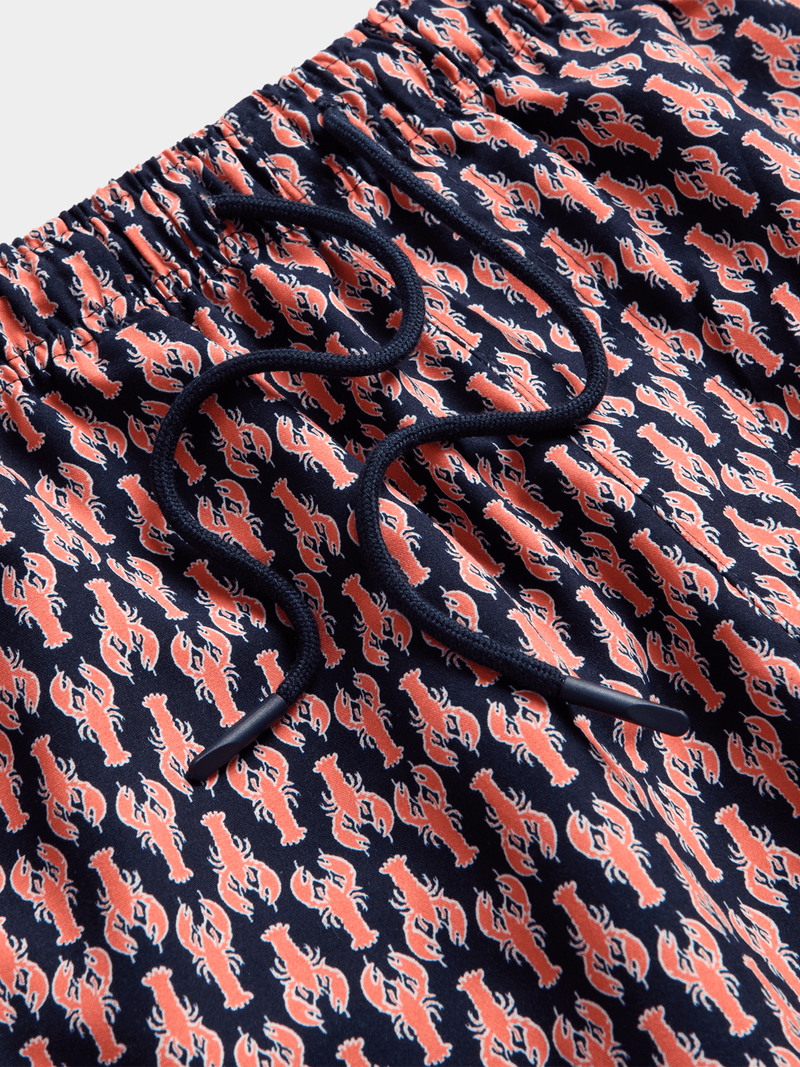 Embrace sunny days with our navy and red lobster print swim shorts from Exact. These shorts feature 2 side pockets, 1 back pocket, and an elasticated waist with drawstring for a comfortable fit. Perfect for pool parties or beach escapades.