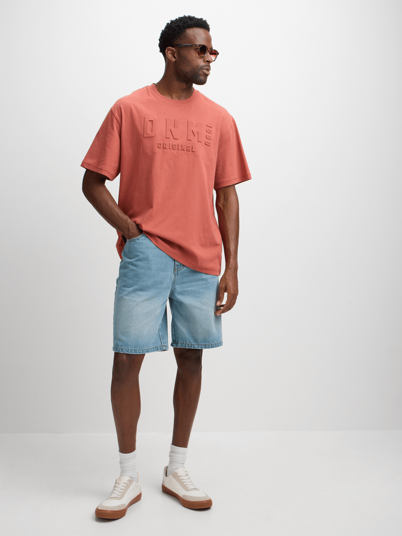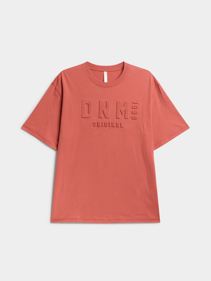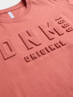 Stay stylish with this Exact red embossed t-shirt. Made from a single jersey cotton fabric, this tee features a unique embossed slogan on the chest. It's a versatile piece perfect for any wardrobe.