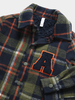 Keep your little one warm and stylish in our checked shacket. Featuring a trendy fatigue & orange check design with cozy borg lining, this shacket is perfect for cool weather. Made from durable melton fabric.