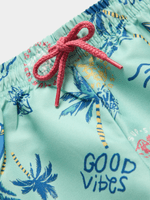 Get ready for some fun in the sun with these vibrant green swim shorts featuring a cool beach print, 1 back pocket, and and elasticated waist with drawstring. Perfect for beachy days.