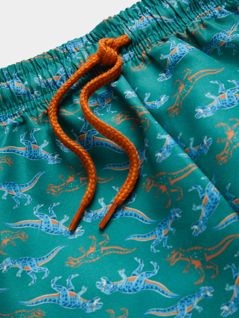 Get ready for some fun in the sun with these vibrant green swim shorts featuring a cool dino print, 1 back pocket, and an elasticated waist with drawstring. Perfect for beachy days.