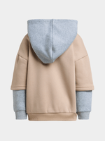Get ready for dino-mite adventures with our natural and grey twofer hoodie from Exact! Made with a cotton rich fabric, this hoodie features a cool graphic print, twofer design, hooded neck, and ribbed cuffs, and hem. Perfect for playtime or chilling at home.