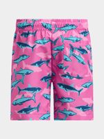 Get ready for some fun in the sun with these vibrant pink swim shorts featuring a cool shark print, 1 back pocket, and an elasticated waist with drawstring. Perfect for beachy days.