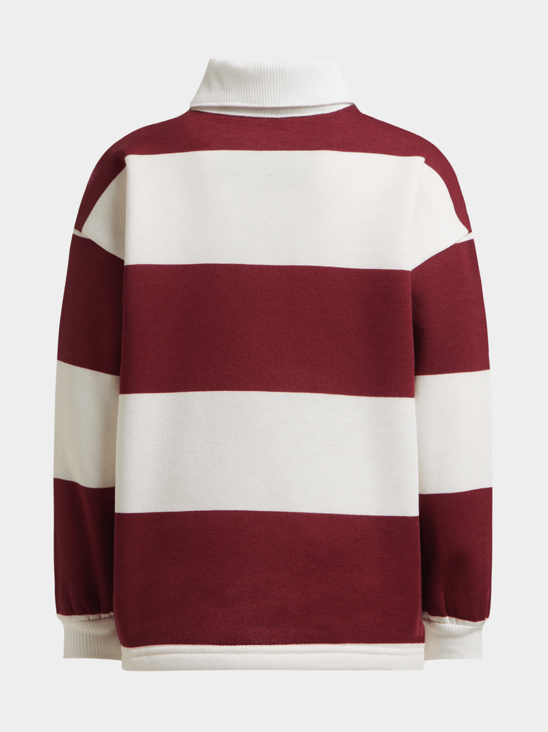 Keep your little man cozy and on-trend with our Exact red and white striped polo sweat top. Made from fleece fabric, this sweat top features a chest print, ribbed cuffs and collar, and a button up lapel. Perfect for keeping your little one looking sharp without sacrificing comfort.