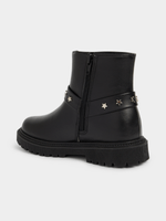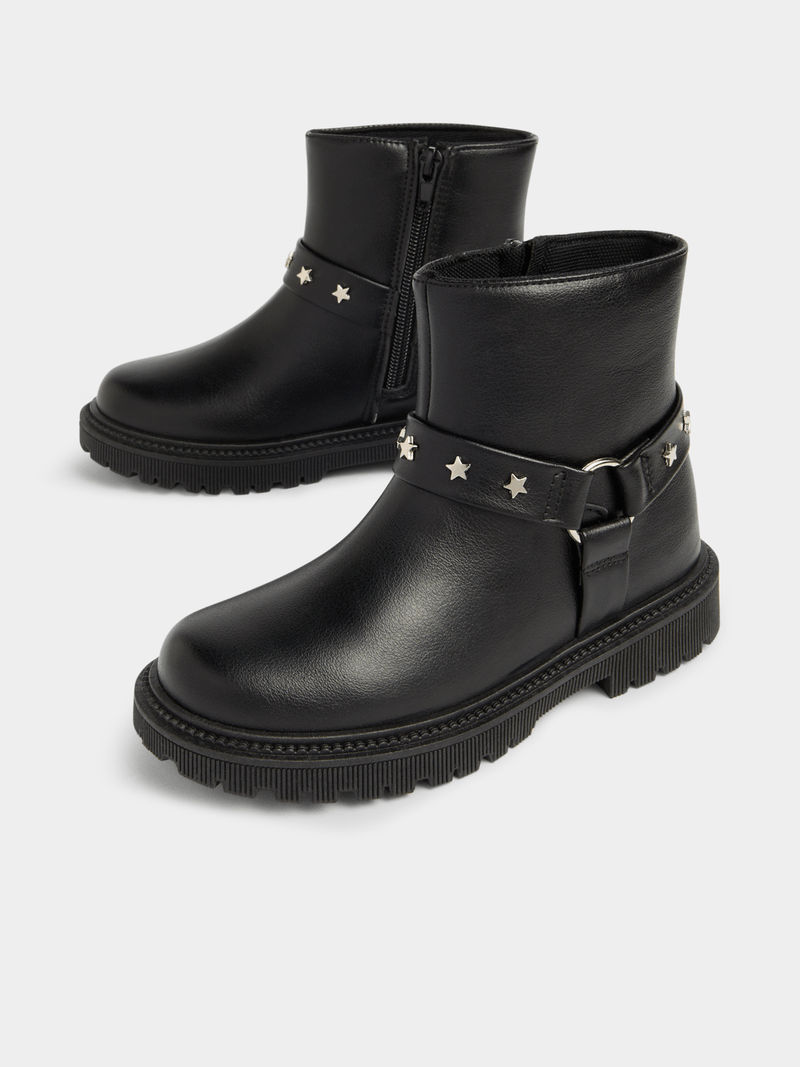 Get your little one ready to take on the day with these Exact black chelsea biker boots. Featuring buckles with silver star details, and a side zip for an easy fit Bring out her inner fashionista with these versatile boots.